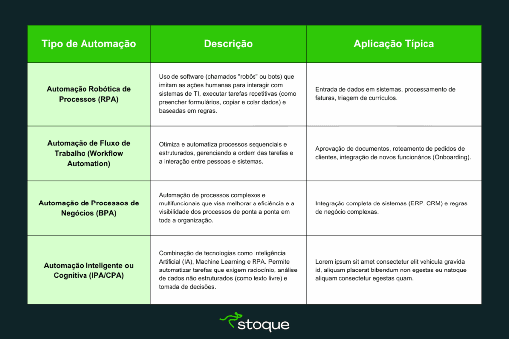 A automação não se resume a um único tipo de tecnologia. Ela se manifesta em diferentes níveis de complexidade e aplicação. Os tipos mais estratégicos incluem:
